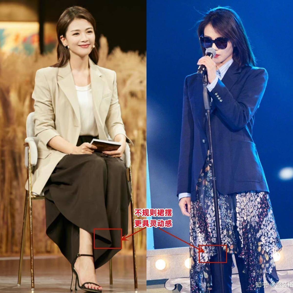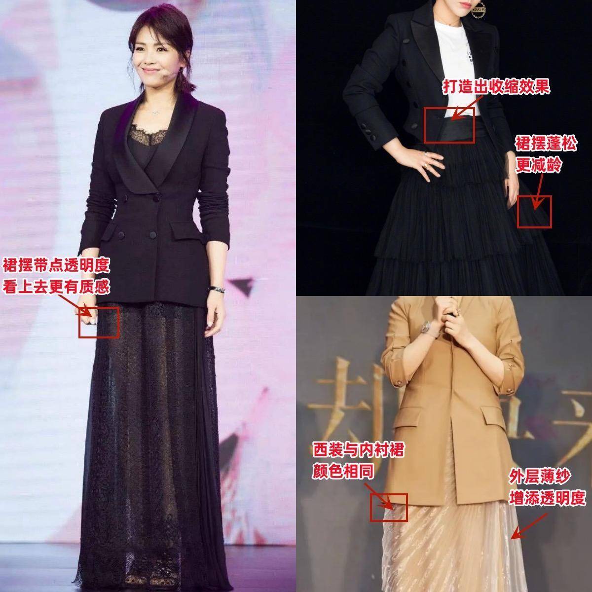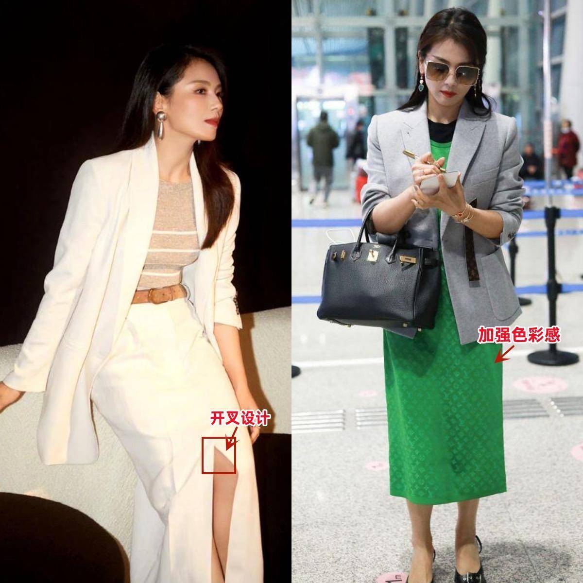 作为经常出席正式场合的女明星,衣橱里最必不可缺的就是西装,而且时尚款西装,还能日常通勤一把抓。带点设计感的皮衣西装、收腰西装、短西装,配各种类型的半身裙,都是很出彩的。